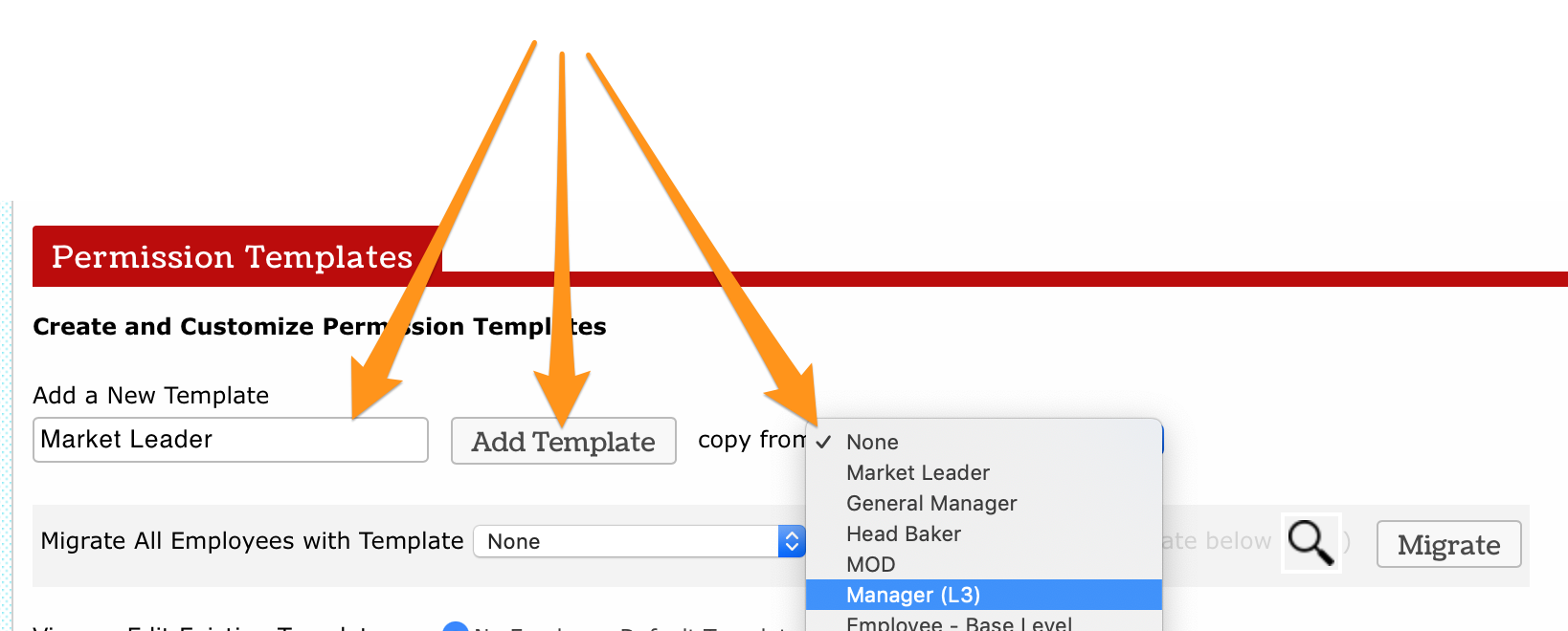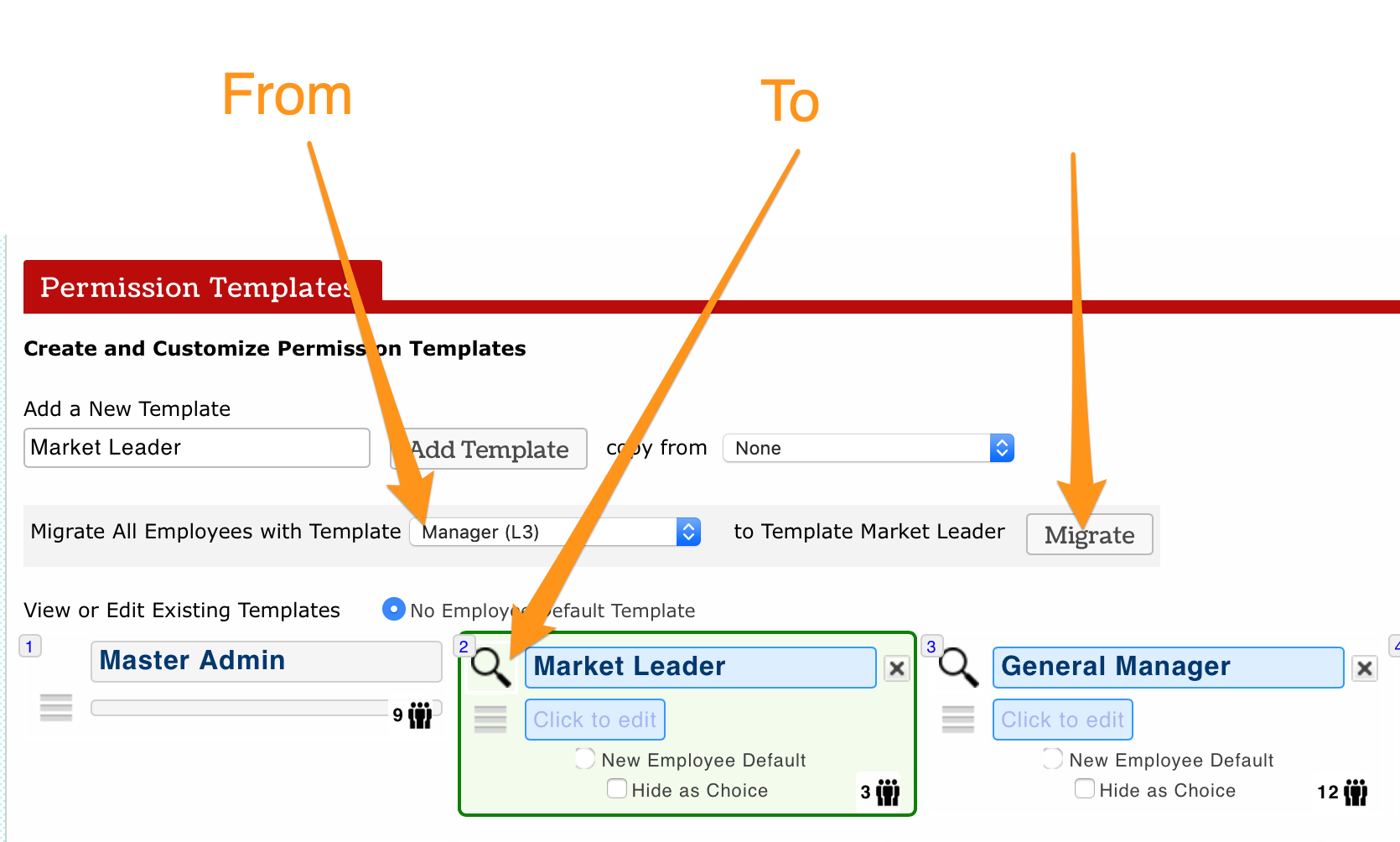 To migrate employees from one template to a new template (for instance if you want to migrate employees to a custom template), select the template to migrate FROM, and TO, as shown below, and press Migrate