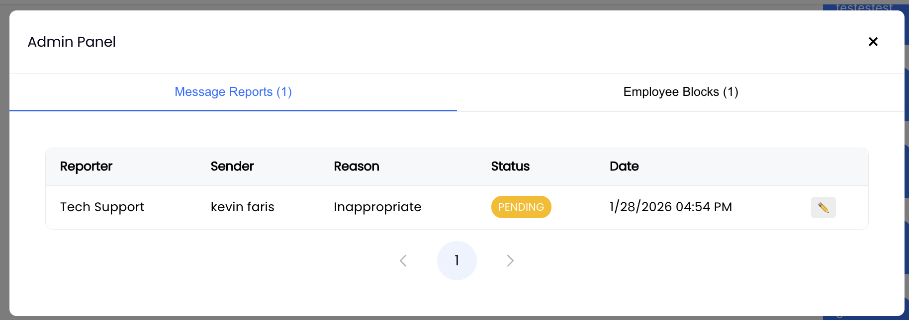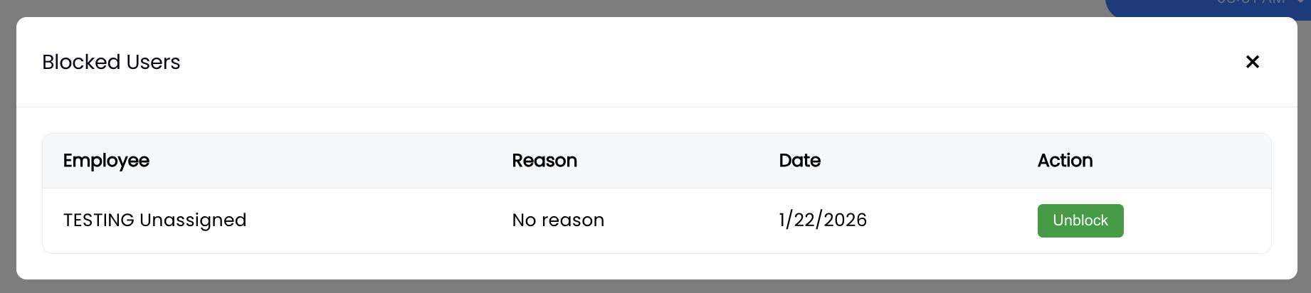 Administrators can view a list of all employee blocks in the admin panel. While no action is required for blocks (they happen automatically when an employee chooses to block someone), this visibility allows administrators to identify potential workplace issues that may need attention or intervention.
