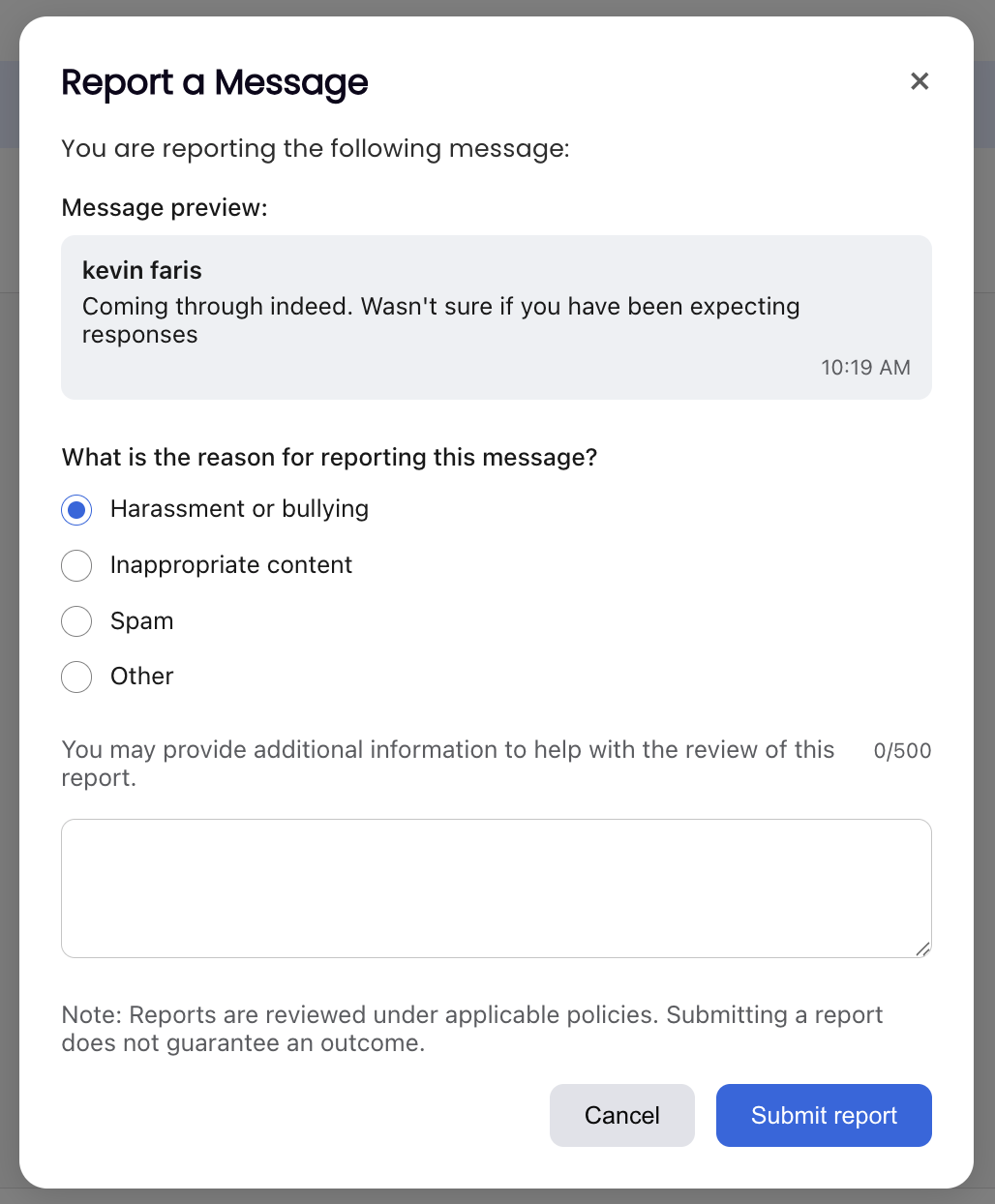 You'll see a confirmation that your report has been submitted. Reported messages are reviewed by your company administrators, and you'll see an indicator on the message showing it has been reported.